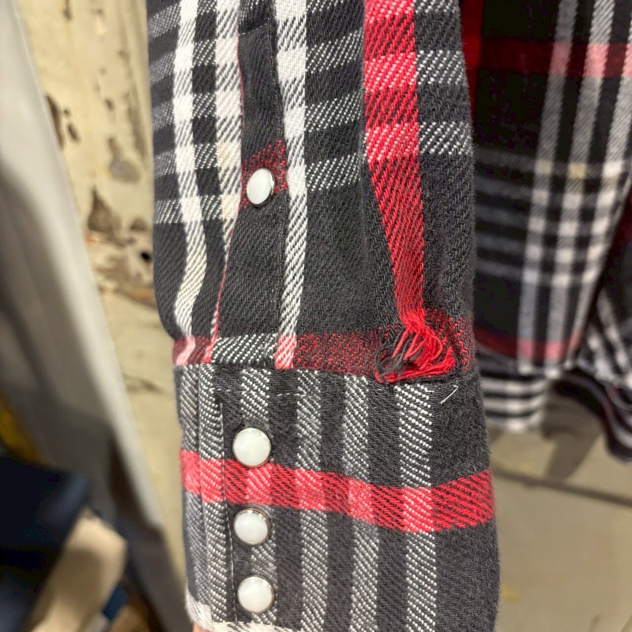 右袖に破れ、左袖にはボタンの欠陥があります。