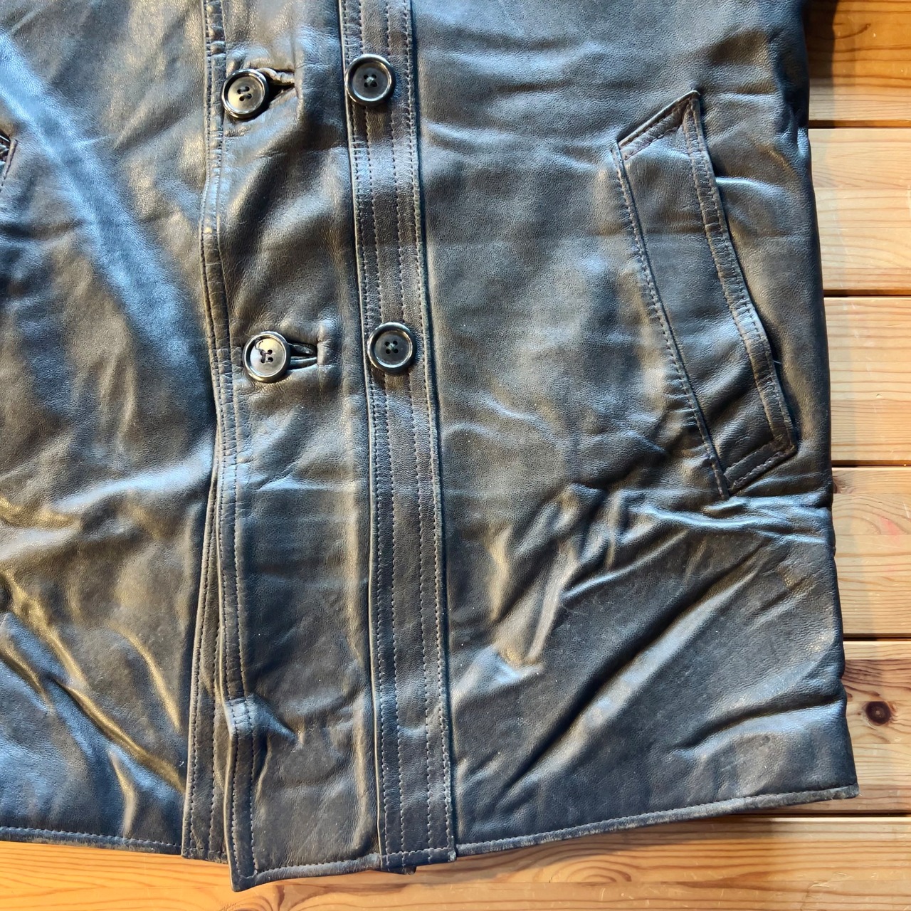 レザーの生地感、フロントの2列のボタン、首周り、シルエットなどなど細部までかっこいいアイテムです!